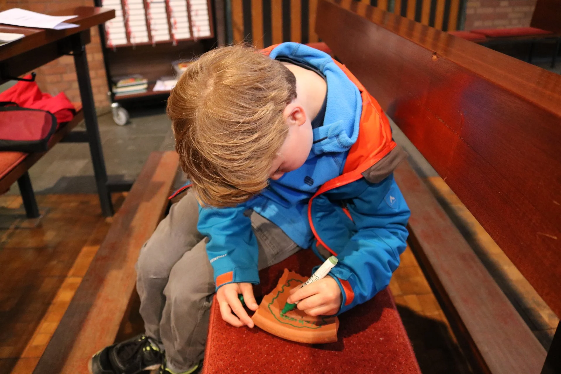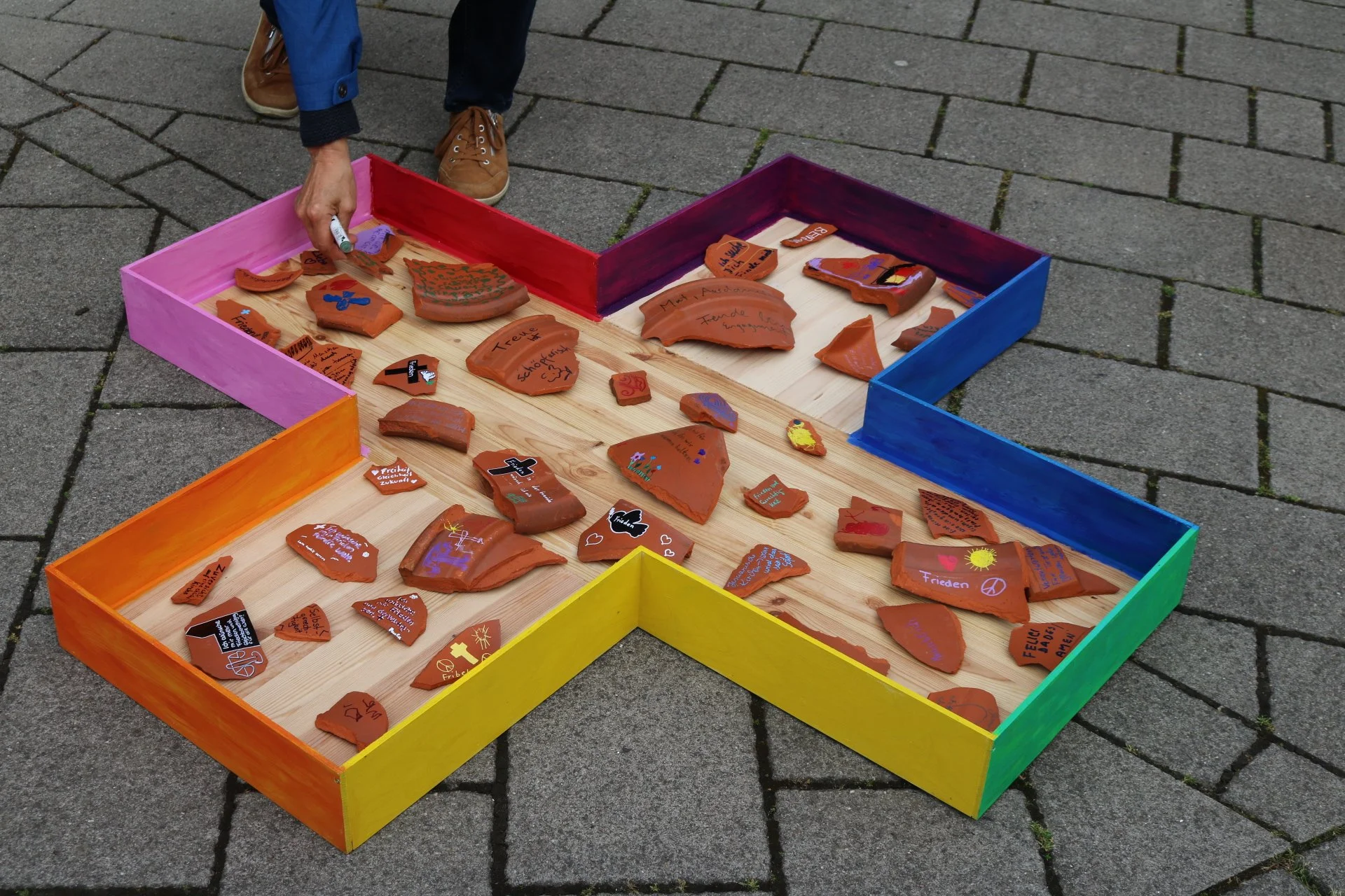 Im Regenbogenscherbenkreuz konnten die Besucher*innen eigene Gebete, Gedanken und Wünsche formulieren. Mit einem feierlichen Segen endete das Gebet. Im Anschluss gestalteten die Jugendlichen unserer Pfarrei ein Banner mit dem Motto der Aktionswoche.