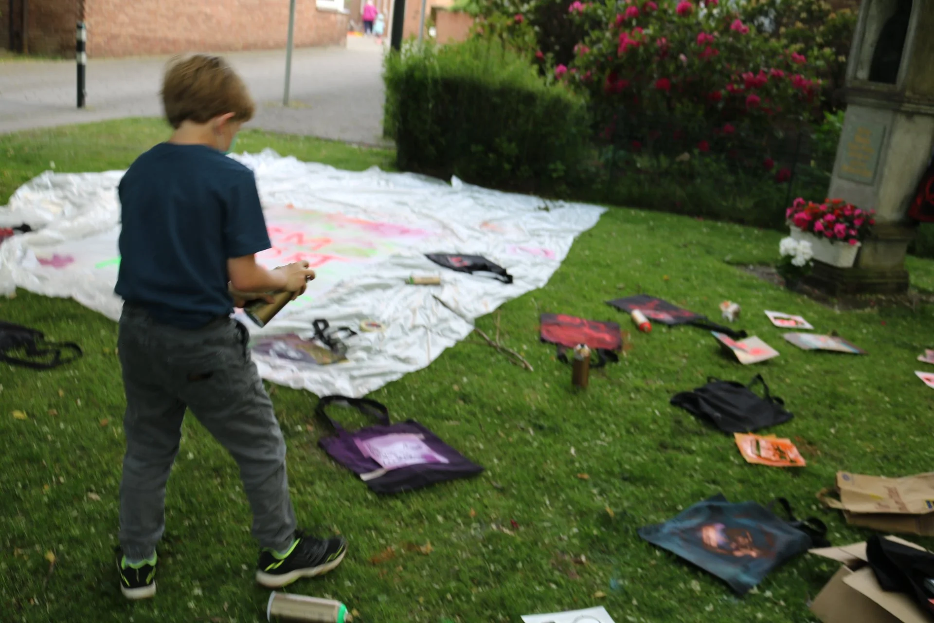 Kinder und Jugendliche gestalteten ein Transparent und Stofftaschen in einer Spray-Aktion…